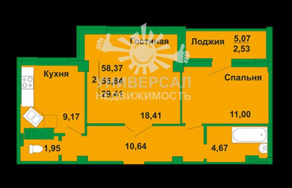 - Общая площадь: 58.0 м²